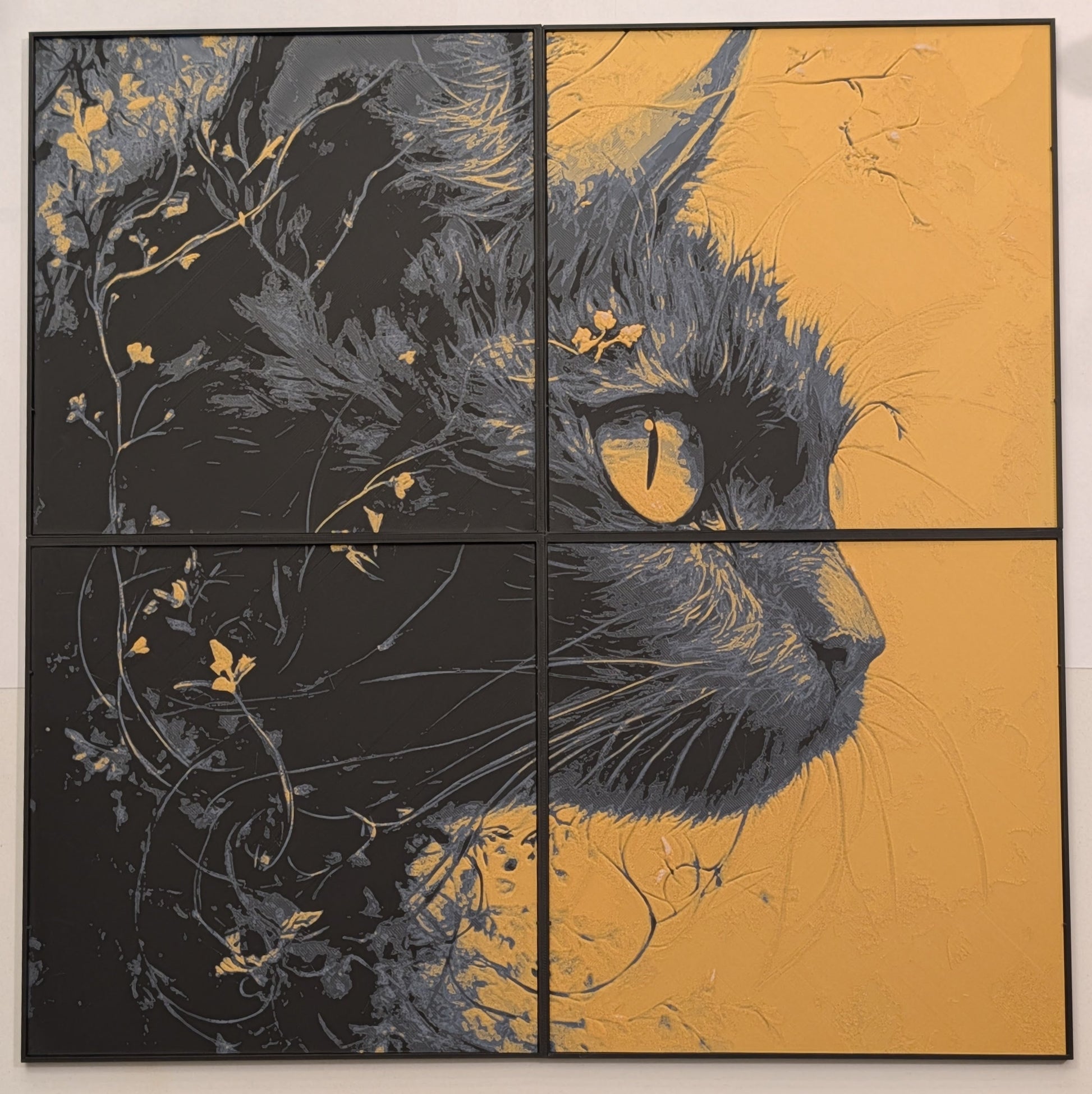Admire the mysterious beauty of a cat with golden eyes in this stunning 4-panel Hueforge artwork! Featuring the feline's captivating gaze across four connected panels, this 3D printed piece creates a mesmerizing display that draws you in. Perfect for cat lovers, mystical decor, or anyone who appreciates the enigmatic nature of our feline friends!