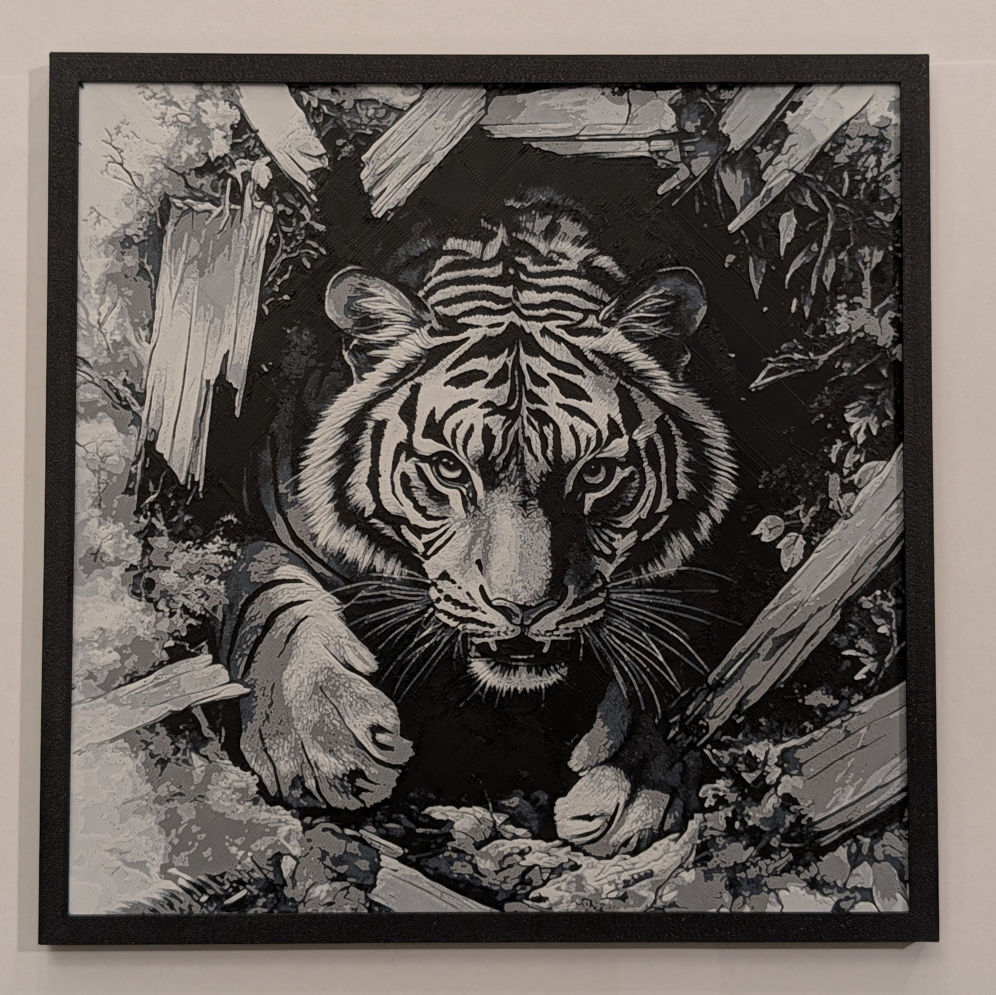 Roar with power with this majestic tiger animals Hueforge artwork! Featuring the magnificent striped predator with its piercing eyes and powerful stance, this 3D printed piece captures the strength and beauty of the king of the jungle. Perfect for wildlife enthusiasts, big cat lovers, or anyone who appreciates the raw power of nature!