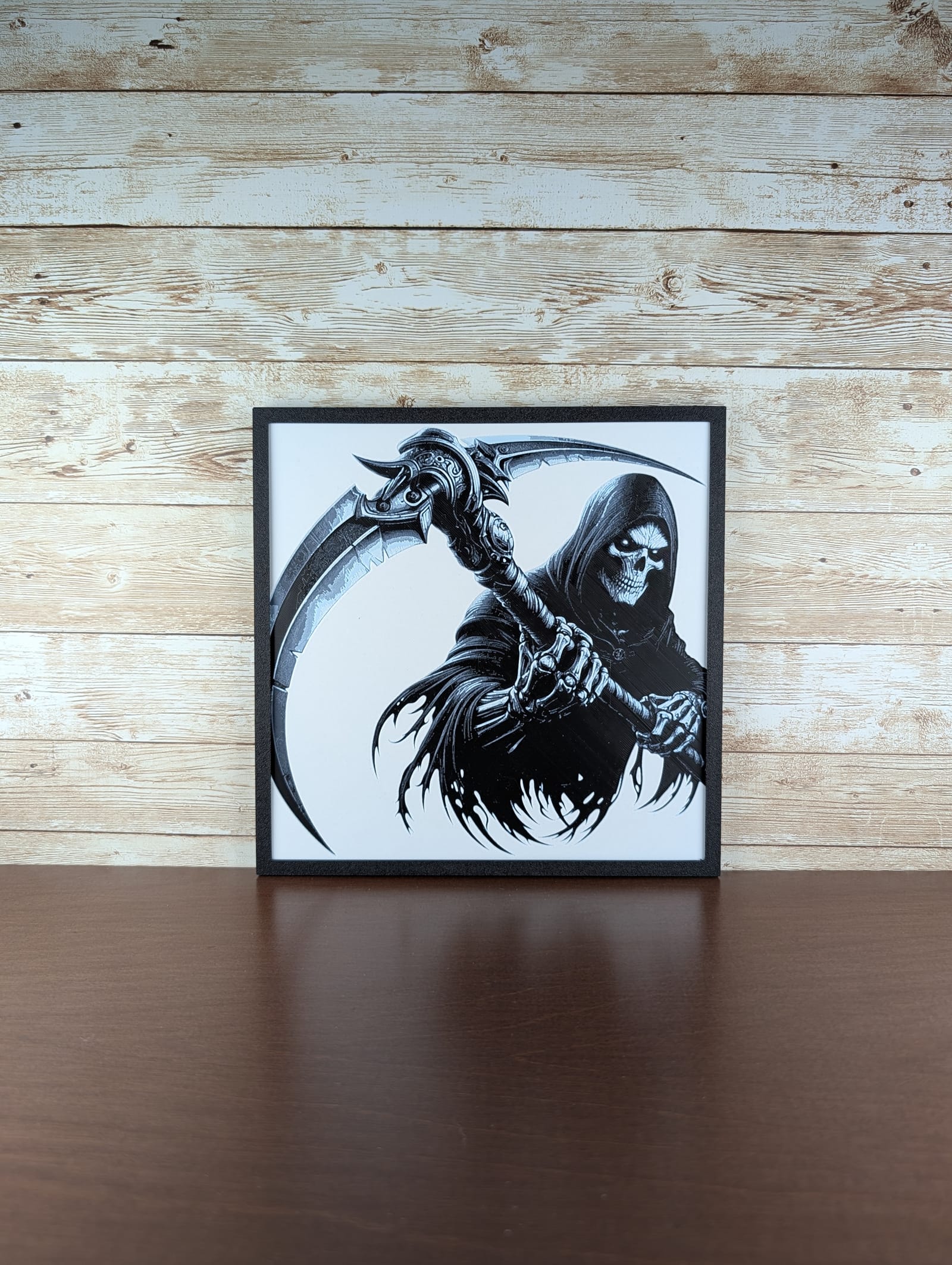 Embrace the spectral presence of the Grim Reaper, rendered in stark black and white, as it surveys its domain with an imposing scythe. This iconic figure makes a profound statement, perfect for those who appreciate macabre decor or gothic aesthetics in their home or office. Its intricate details and subtle filament depth make it a compelling conversation starter and a unique collectible gift for fans of dark fantasy. Bring an aura of mystery and power to any space with this captivating piece, a unique take on classic imagery.