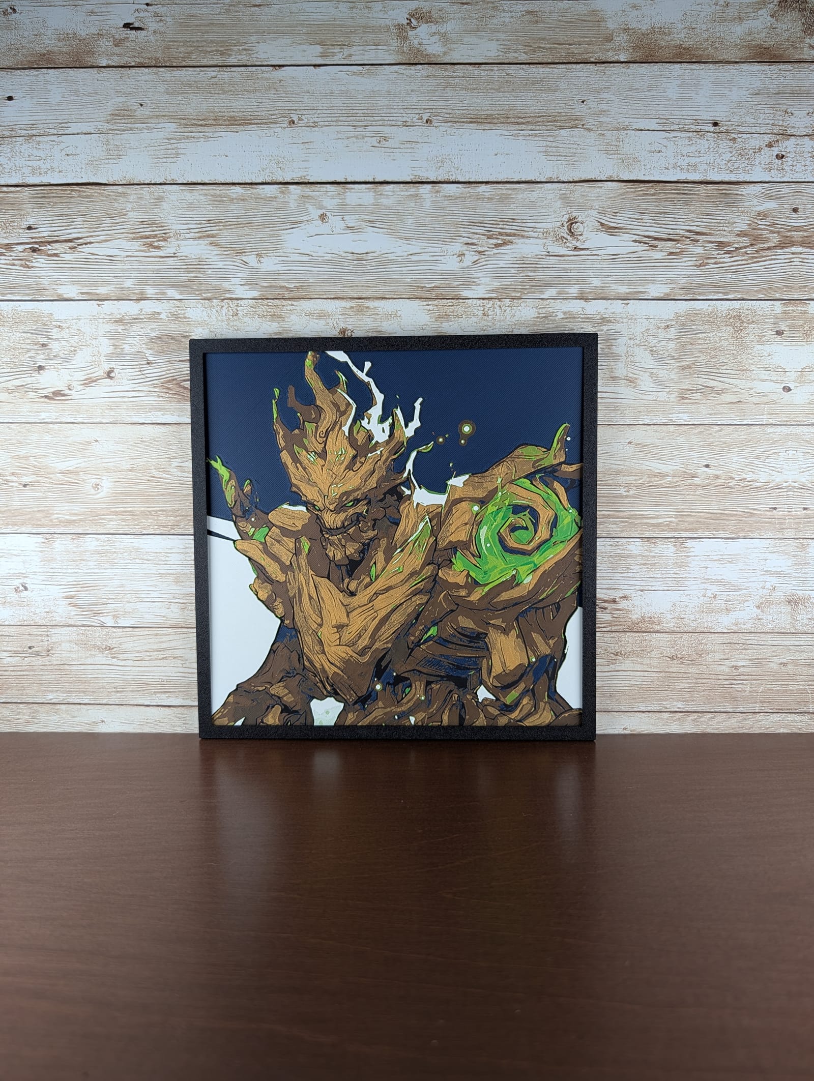 Witness the fierce resolve of Groot as he channels his power, captured in a moment of heroic intensity. This striking piece brings the unwavering spirit of the beloved Guardian of the Galaxy into any space, perfect for Marvel enthusiasts, collectors, or anyone seeking a unique statement piece for their home, office, or game room. The dynamic lines and vibrant green energy, rendered with subtle filament depth as a 3D printed HueForge creation, make Groot truly leap from the surface, celebrating his strength and iconic presence.