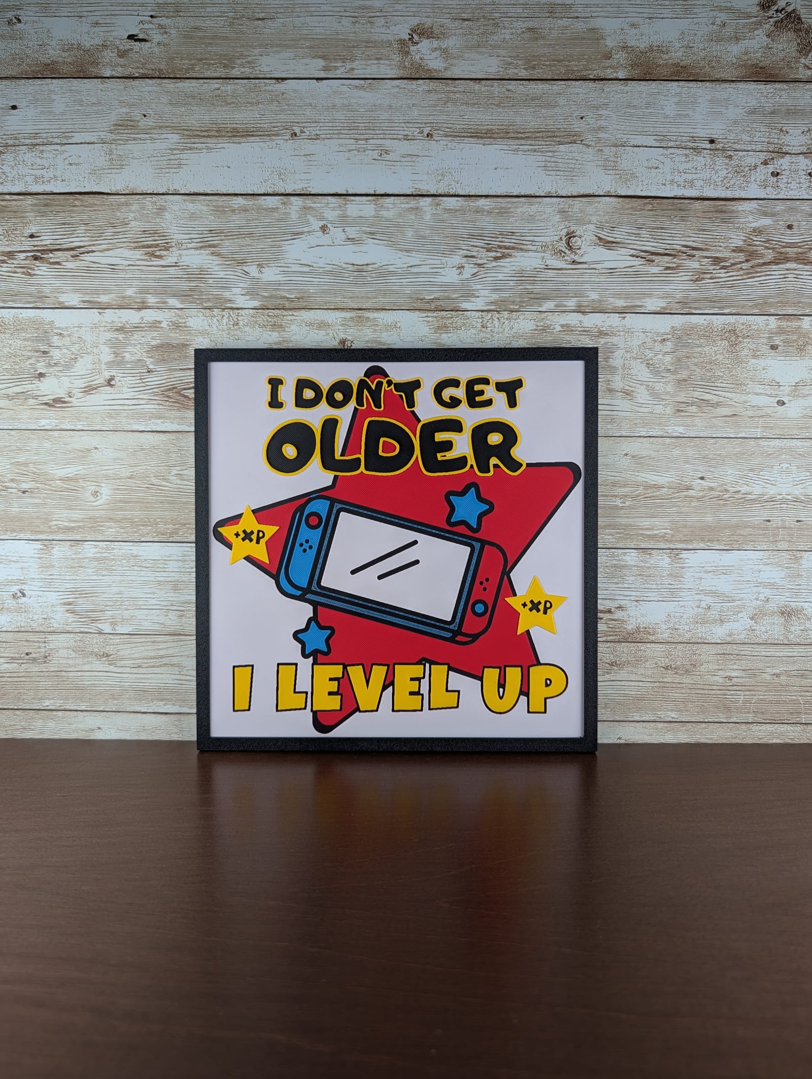 Celebrate every year as an exciting new stage with this vibrant 'I Don't Get Older I Level Up' piece. Perfect for the dedicated gamer, this unique wall art transforms birthdays into an epic achievement, featuring a classic console graphic amidst playful XP stars. Its crisp lines and cheerful colors create an engaging focal point for any desk or wall, reminding everyone that life is meant to be enjoyed and conquered. The subtle filament depth of this 3D printed wall art adds a unique tactile dimension, making the bold text and console graphic truly pop as a thoughtful gamer gift or collectible decor.