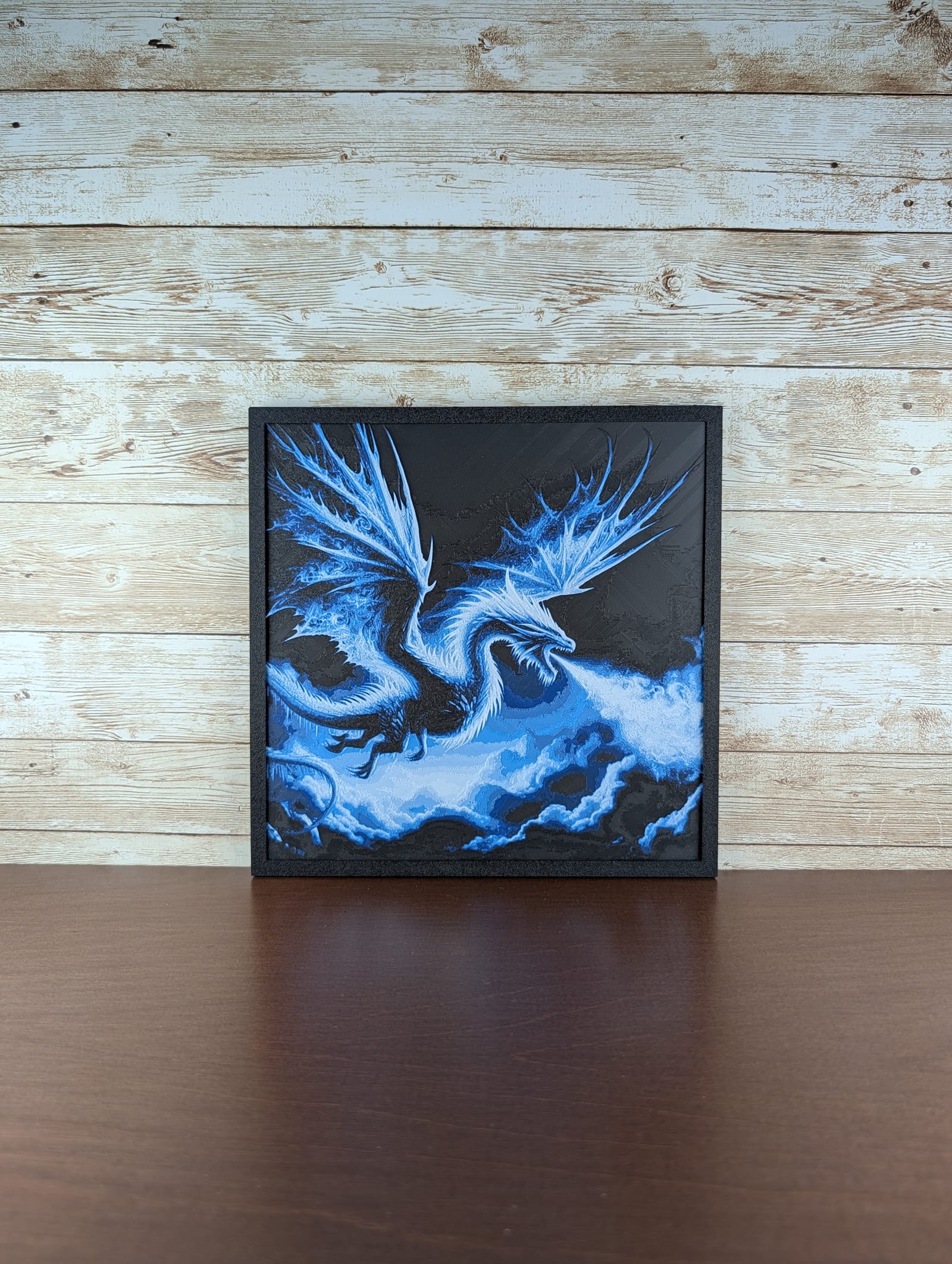 Unleash the chilling power of the Ice Breath Dragon across your space, captured mid-flight with frosty breath billowing from its fearsome maw. This commanding piece offers a striking focal point for any fantasy enthusiast, gamer, or collector seeking a unique statement and an exceptional gift. Its vibrant blues against the dark background bring an ethereal glow to any room, transforming a flat surface into a portal to a mythical realm. Experience the subtle depth and captivating visual texture that defines this carefully created 3D printed work, ensuring it stands out and invites endless admiration.