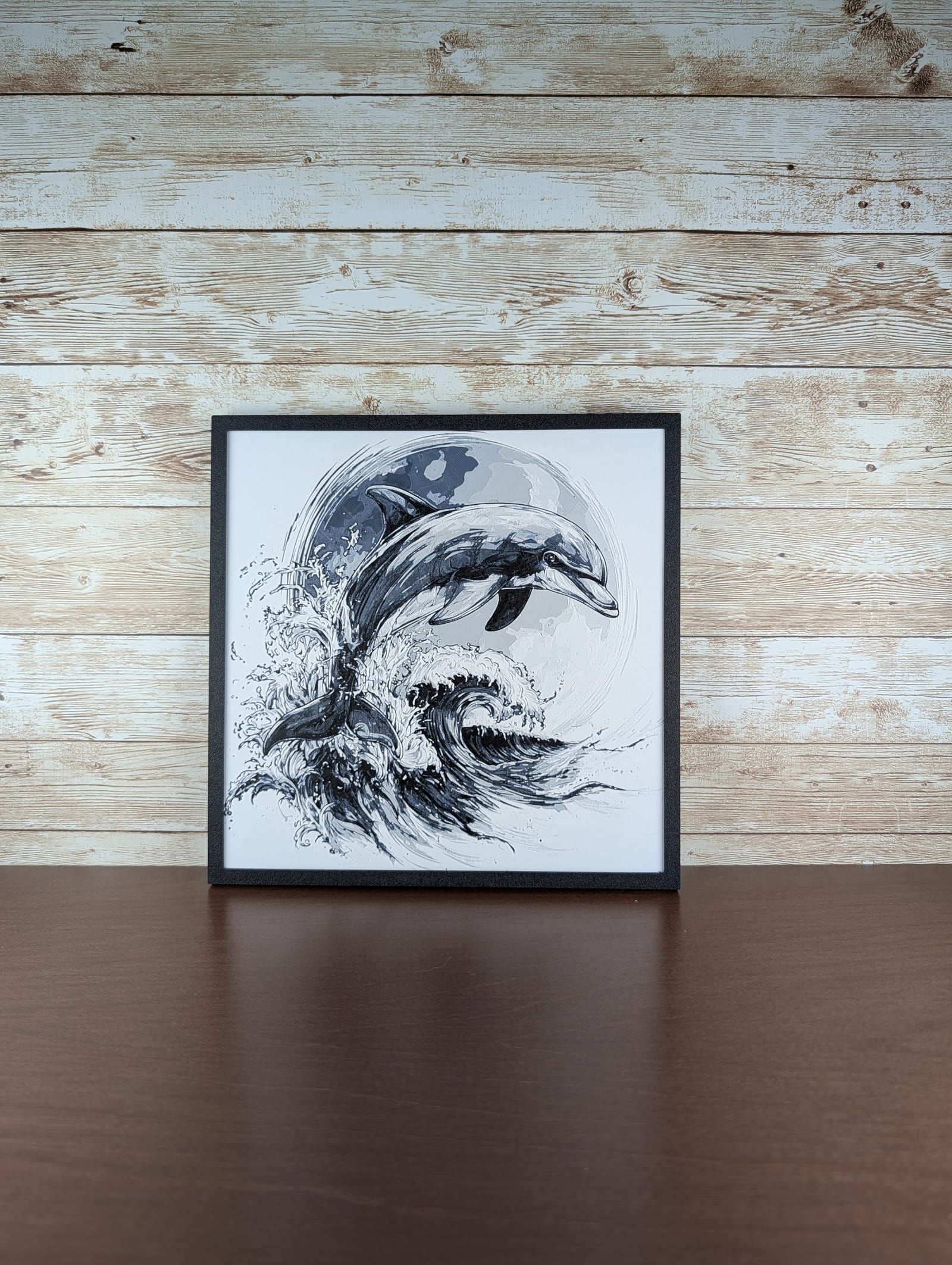 Experience the graceful power of the ocean with this captivating leaping dolphin, frozen mid-air above crashing waves. Against the subtle backdrop of a full moon, this dynamic piece brings the majesty of marine life into any space, making it an ideal focal point for your living room or a serene addition to an office. The intricate details of the water and the dolphin's form are beautifully rendered, creating a striking visual depth that feels truly unique. This artwork, expertly realized as a 3D printed HueForge piece, makes a thoughtful gift for any ocean enthusiast or a cherished collectible for your own home decor.