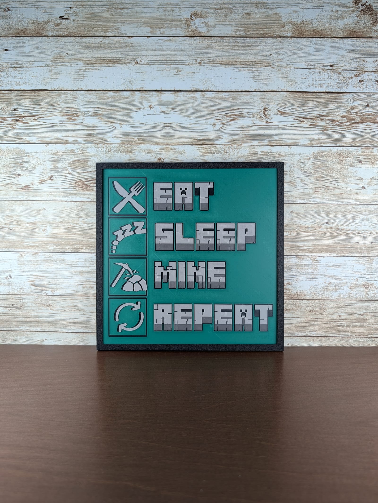 Embrace the blocky world and iconic grind of your favorite game with this vibrant 'Eat Sleep Mine Repeat' wall art, a perfect declaration for any dedicated player. This piece perfectly captures the spirit of endless adventure and creation, making it an ideal gift for gamers, a must-have collectible, or a standout feature in any gaming room. The design, with its distinct blocky lettering and recognizable icons including the subtle Creeper 'A', comes to life with the unique subtle depth of a 3D printed finish. Elevate your space and showcase your passion for the pixelated universe with this captivating statement.