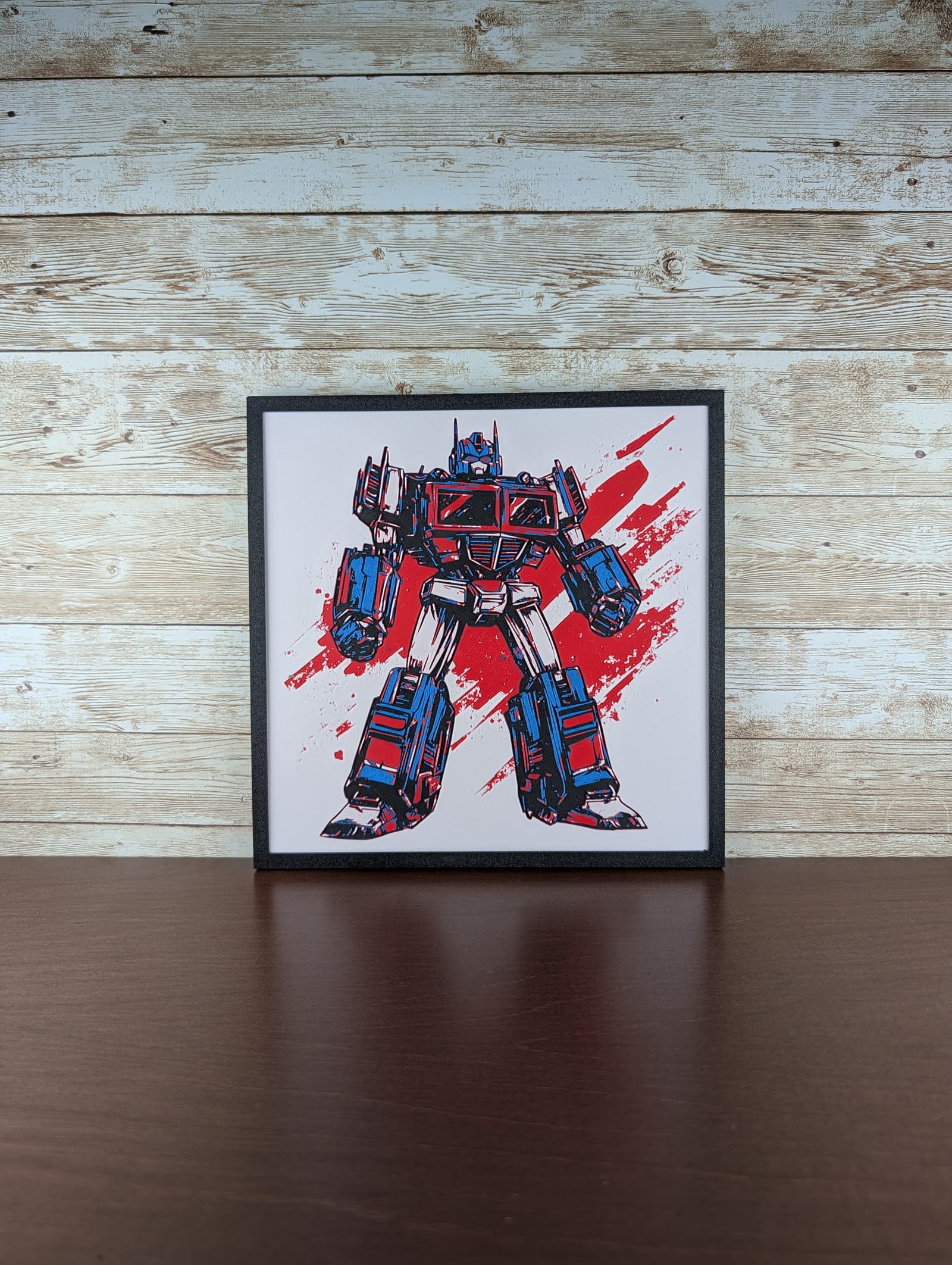 Command attention with this bold depiction of Optimus Prime, the legendary leader of the Autobots, standing ready for battle against a dynamic crimson backdrop. This captivating piece of wall decor is an ultimate collectible for any Transformers fan, bringing a touch of heroic nostalgia and powerful presence to any space. Expertly crafted, this unique HueForge print, featuring subtle filament depth, makes an unforgettable gift or a striking focal point in a game room, office, or living area.