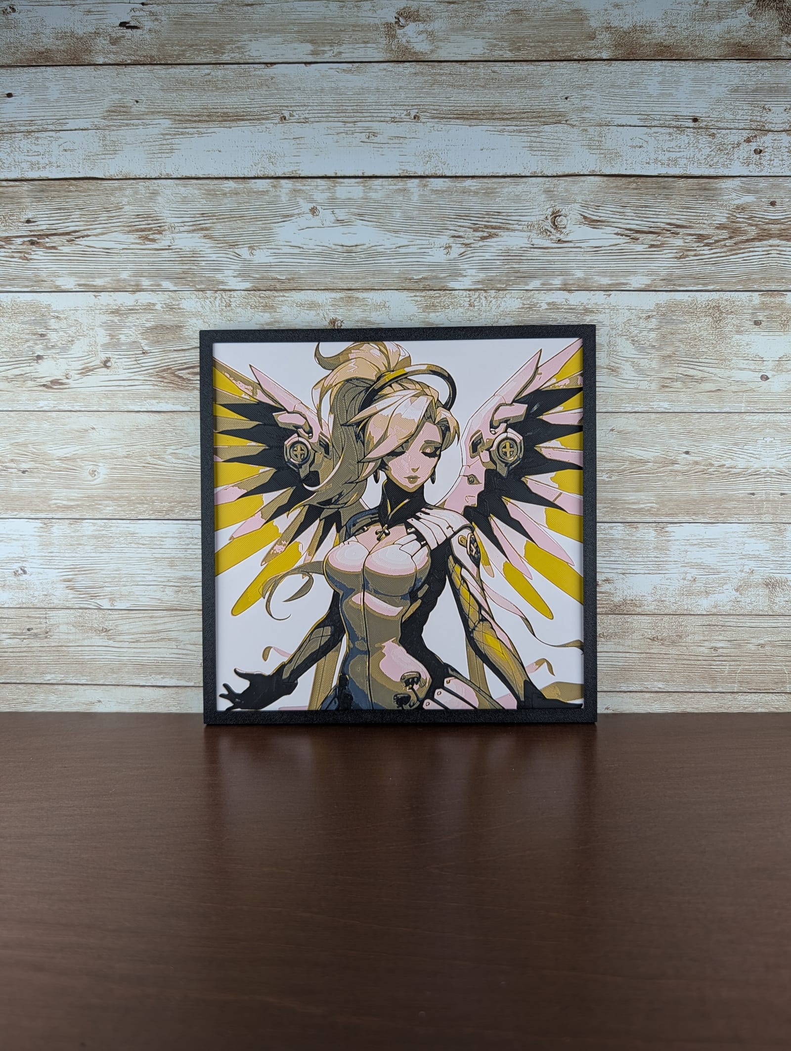 Embrace the compassionate spirit of Overwatch's iconic healer, Mercy, with this striking piece that captures her powerful and graceful presence. Her signature wings and halo are rendered with subtle depth, bringing a unique texture to her classic design. This intricate 3D printed artwork stands out, making it an exceptional collectible for any fan. Perfect for a dedicated gamer's setup, a cherished gift for an Overwatch enthusiast, or a vibrant addition to any fan's home decor.